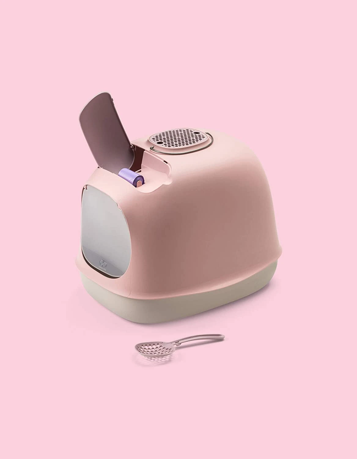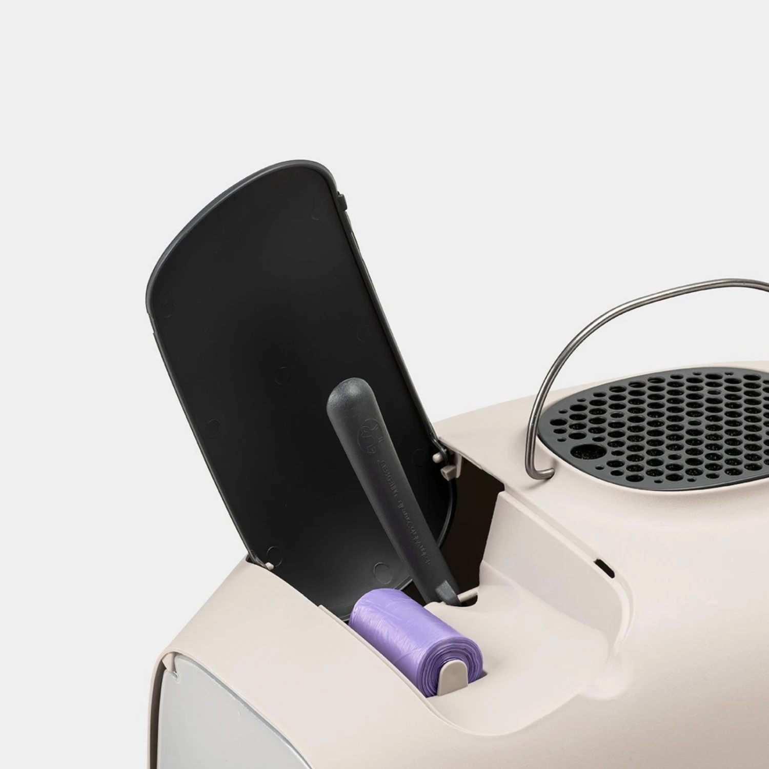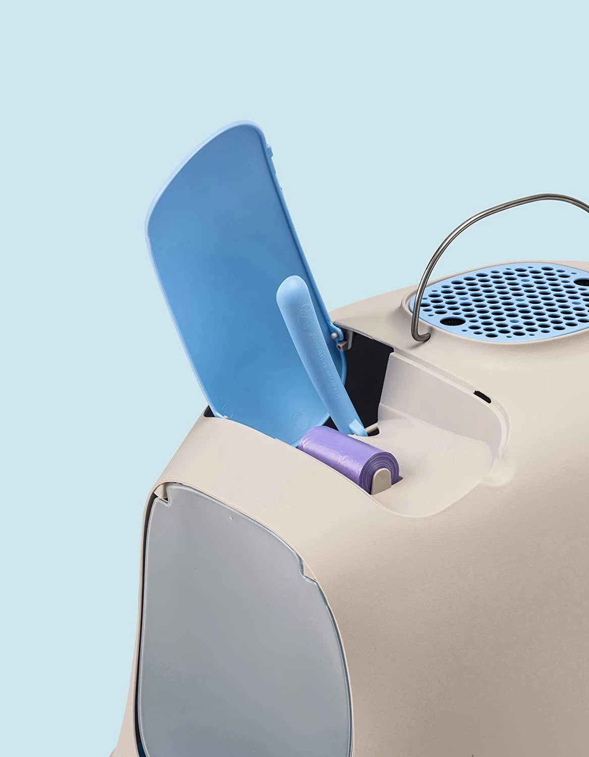 Ce bac à litière est équipé d’un filtre à charbon actif rechargeable et dissimulé à l’intérieur du bac.