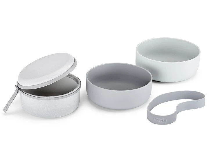 L’ensemble Bento se compose de deux bols en silicone antidérapants de qualité alimentaire pour la nourriture et l’eau, et d’un récipient refermable pour conserver les aliments secs ou les friandises et fabriqué dans un matériau lavable et imperméable.