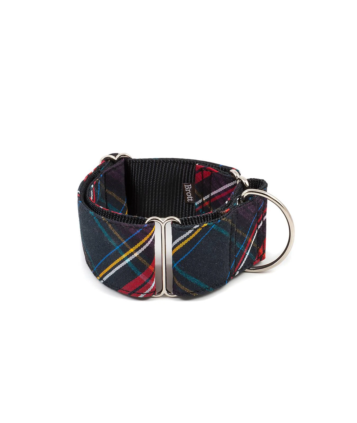 Le collier Cerdanya pour chien est fabriqué à partir de nylon marron de haute qualité avec un tissu écossais bleu marine et rouge 100% classique.