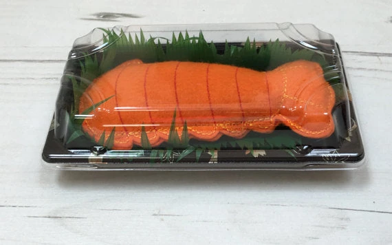 Chaque queue de homard est généreusement gonflée avec de la racine de valériane et de la ouate. Ellle servi sur un lit de «gazon» dans une boîte de sushi.