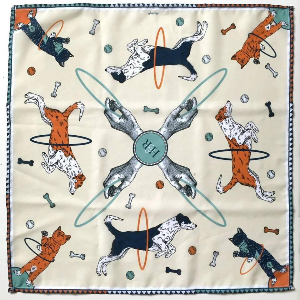 Le duo d’artistes « À Deux Doigts » est invité, par Hariet & Rosie pour une proposition de foulard qui a du chien (et du chat !) : le Carré du Voyage.