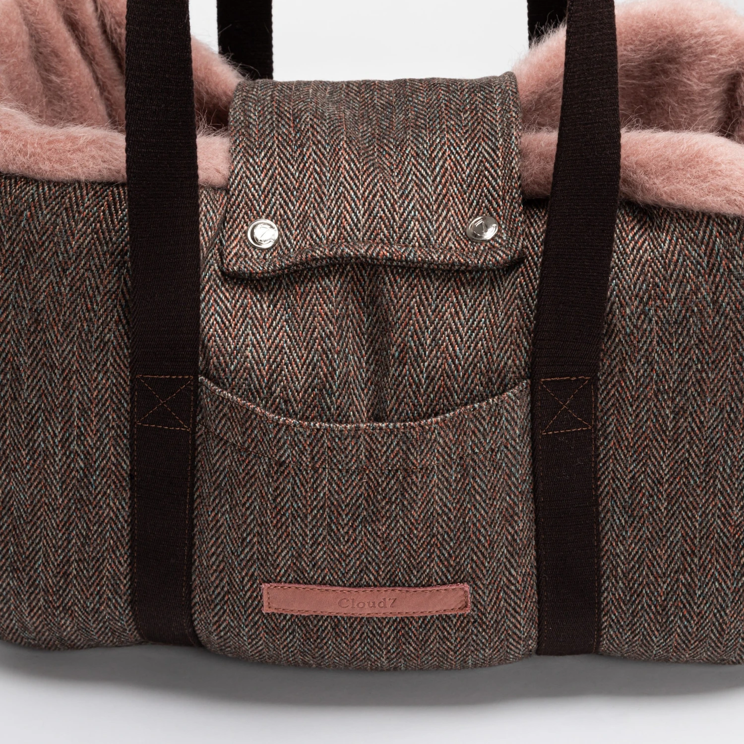 La partie extérieure du sac est fabriquée dans un tissu à chevrons multicolores délicieusement vintage tandis que la doublure offre un nid douillet à votre toutou.