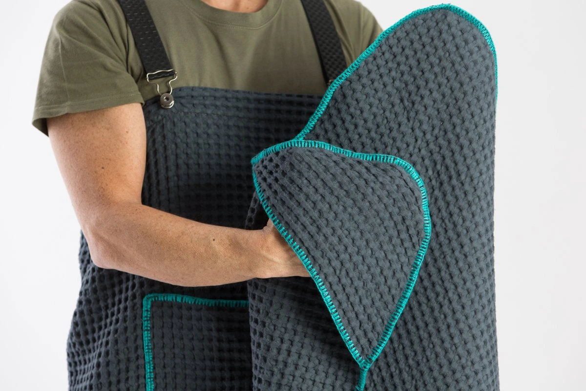 Le tablier a les mêmes couleurs que les serviettes absorbantes Sally.
